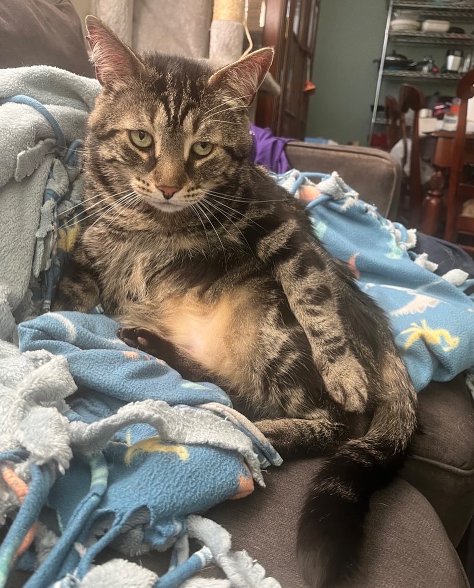 He now enjoys sunbathing in the windows, chasing toys around the living room, and engaging in playful antics with his human companions. His favorite activities include batting at feather toys, climbing onto cozy perches, and curling up in laps for long, contented naps. His “sad face” might suggest melancholy at first glance, but his new family knows better—it’s a quirky expression that only adds to his charm.