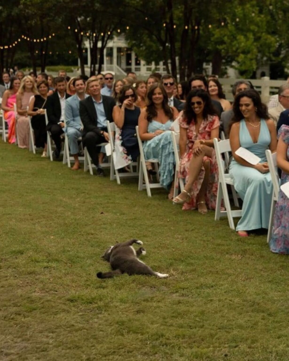 As the ceremony began, the officiant paused to announce an “unexpected visitor.” All eyes turned toward the aisle, and there he was: Grayson, a fluffy gray cat who clearly believed he belonged at the wedding. With complete confidence, he stretched out across the aisle and made himself comfortable in the exact spot where bridesmaids and groomsmen were about to walk.