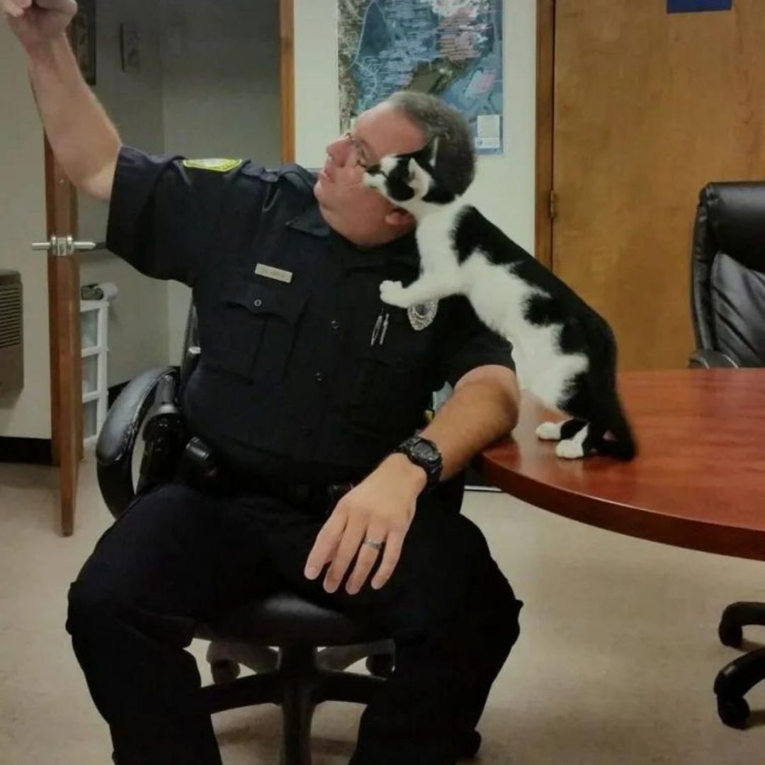 She walked calmly through the busy office, weaving around officers’ legs, and meowing softly for attention. Her behavior immediately drew smiles and laughter from the staff, many of whom were captivated by her unique charm and fearless personality.